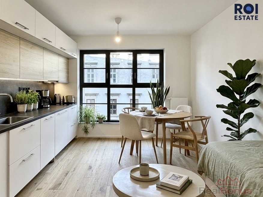 Vstupte do světa čistého designu a moderního pohodlí. Ateliér o výměře 23 m2 se nachází ve 3. patře s výtahem a je připraven stát se vaším novým domovem nebo inspirativním pracovním prostorem. Srdcem hlavní místnosti je luxusní kuchyňská linka na míru v kombinaci bílé barvy a dekoru dřeva, doplněná o elegantní tmavou pracovní desku. Kuchyně je plně vybavena špičkovými vestavnými spotřebiči včetně trouby, varné desky, digestoře, dřezu, vestavné lednice s mrazákem a nechybí ani praktická myčka nádobí a pračka.