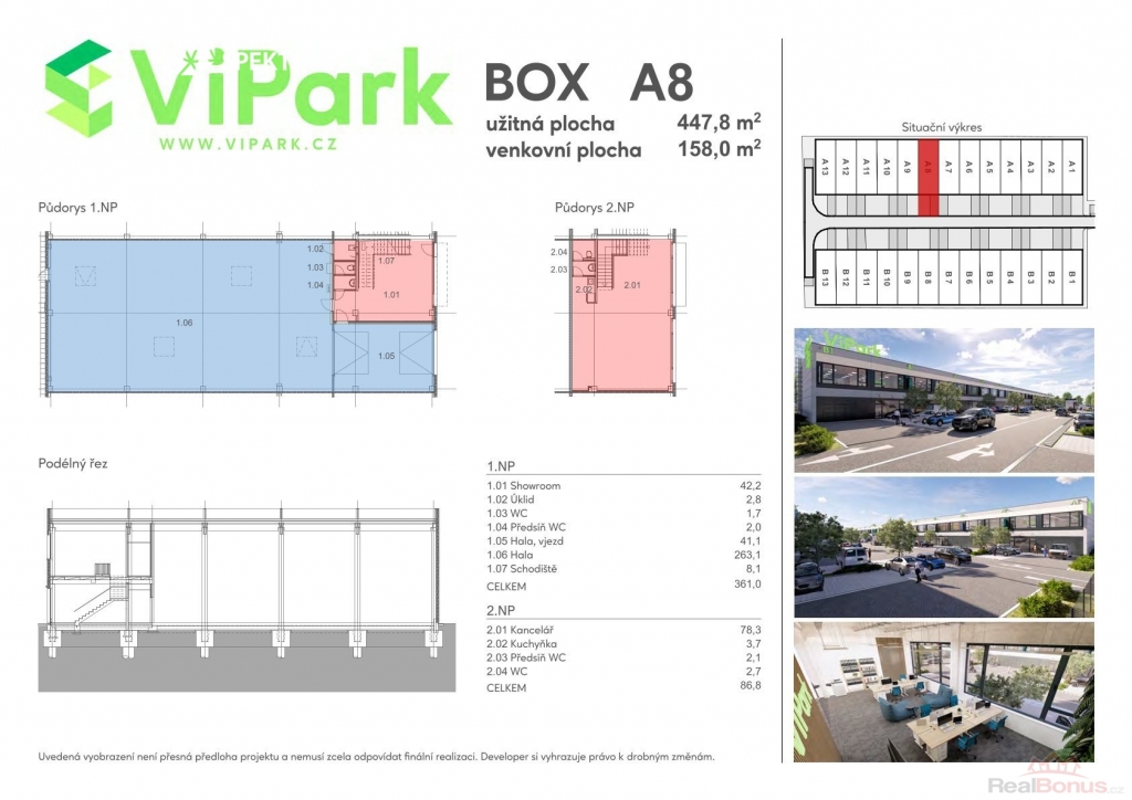 užitná plocha boxu 447,8 m2 (hala 304,2 m2; kancelář, showroom 120,5 m2; zázemí 23,1 m2)