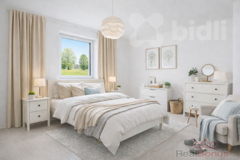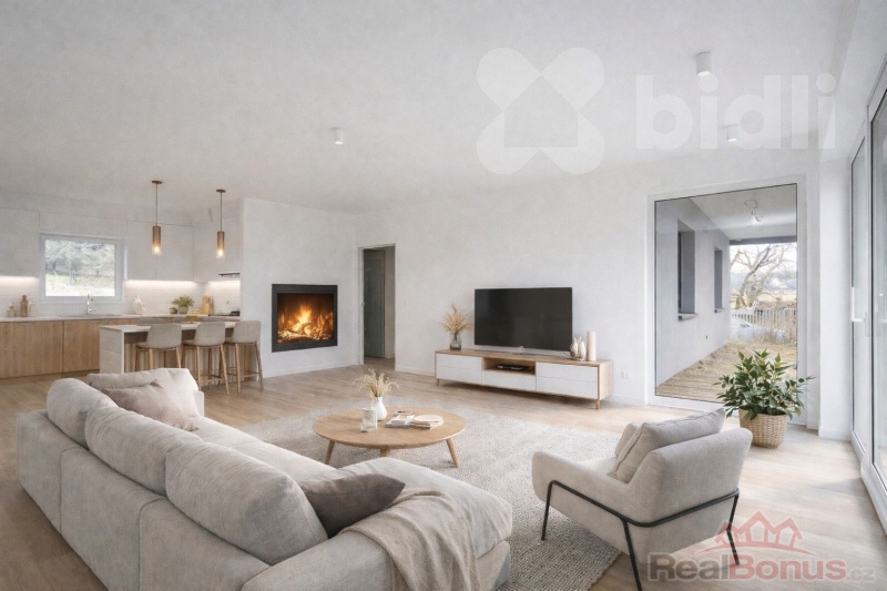 Dispozičně dům nabízí obývací pokoj s kuchyňským koutem a přímým vstupem na terasu a zahradu, dále ložnici, dva samostatné pokoje se šatnou, koupelnu, samostatné WC a technickou místnost.