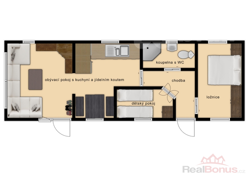 Dispozice : prostorný obývací pokoj propojený s kuchyňským koutem, chodbu, koupelnu s WC, samostatným pokojem a ložnici.