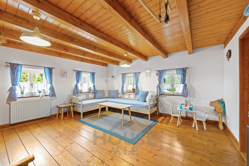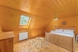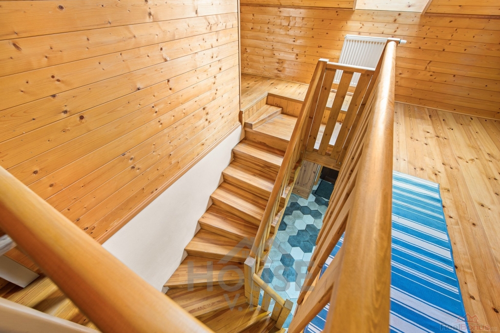 Ve druhém podlaží jsou dvě prostorné ložnice a velká hala, kterou lze využít jako odpočinkovou zónu nebo pracovnu. Interiér působí velmi útulně a vkusně ? dřevěné podlahy, obklady a přiznané trámy vytvářejí hřejivou atmosféru, zatímco moderní vybavení zajišťuje pohodlí pro každodenní užívání.