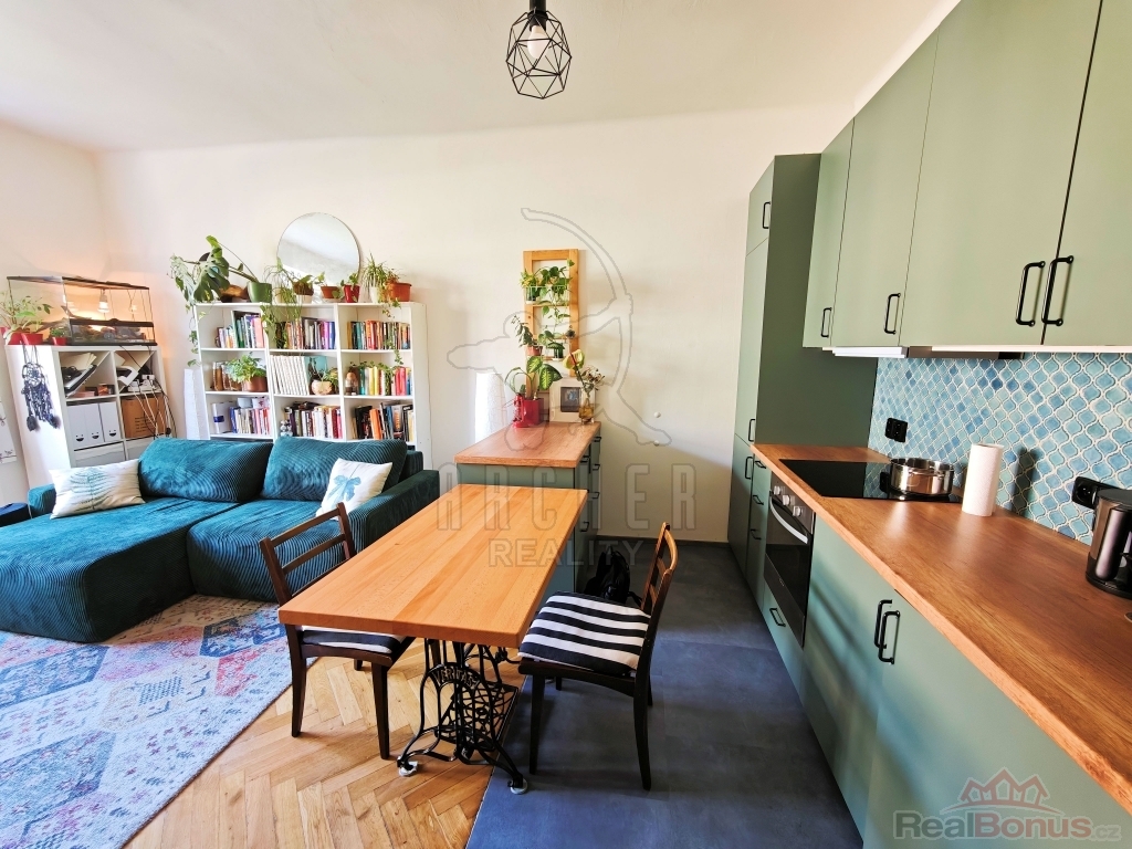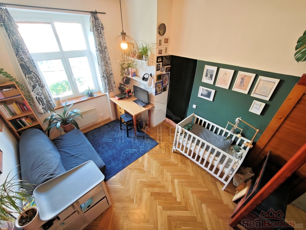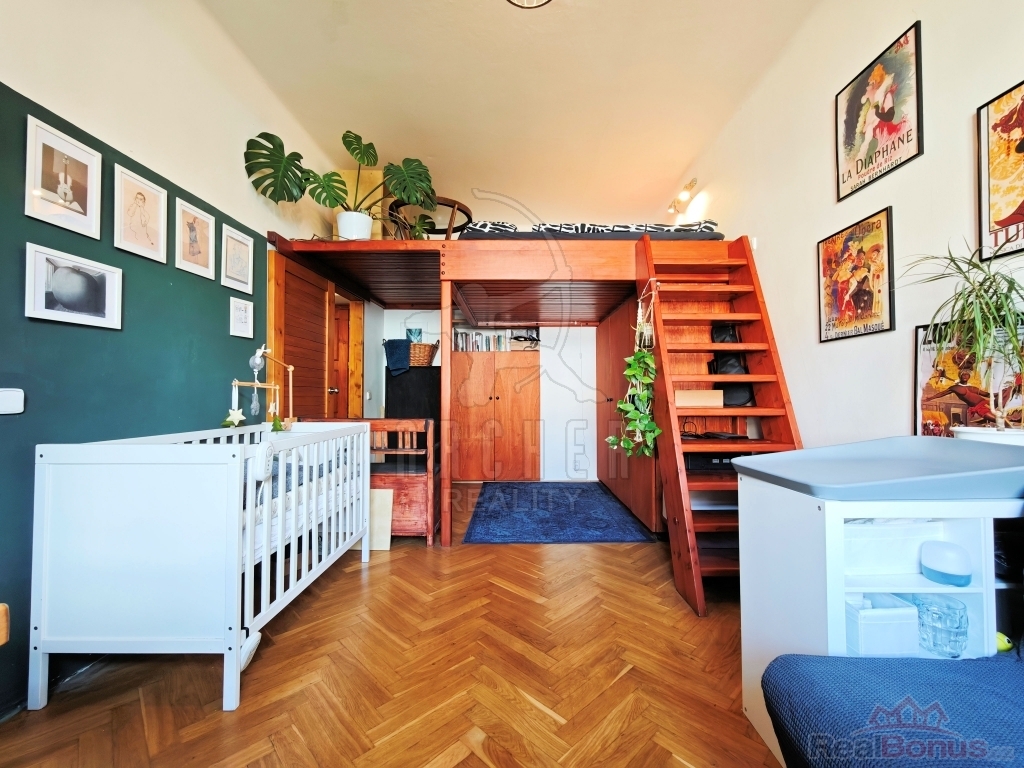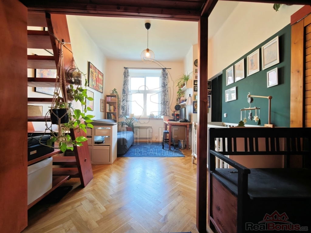 Byt nabízí prostornou vstupní předsíň, obývací pokoj s plně vybaveným novým kuchyňským koutem z roku 2024 (indukce, elektrická trouba, digestoř, myčka, pračka se sušičkou, vestavěná lednice s mrazákem), neprůchozí pokoj/ložnici s vestavěnou skříní a dřevěným patrem ke spaní (výška stropu 3m) se vstupem na menší lodžii.