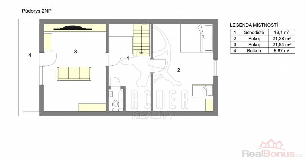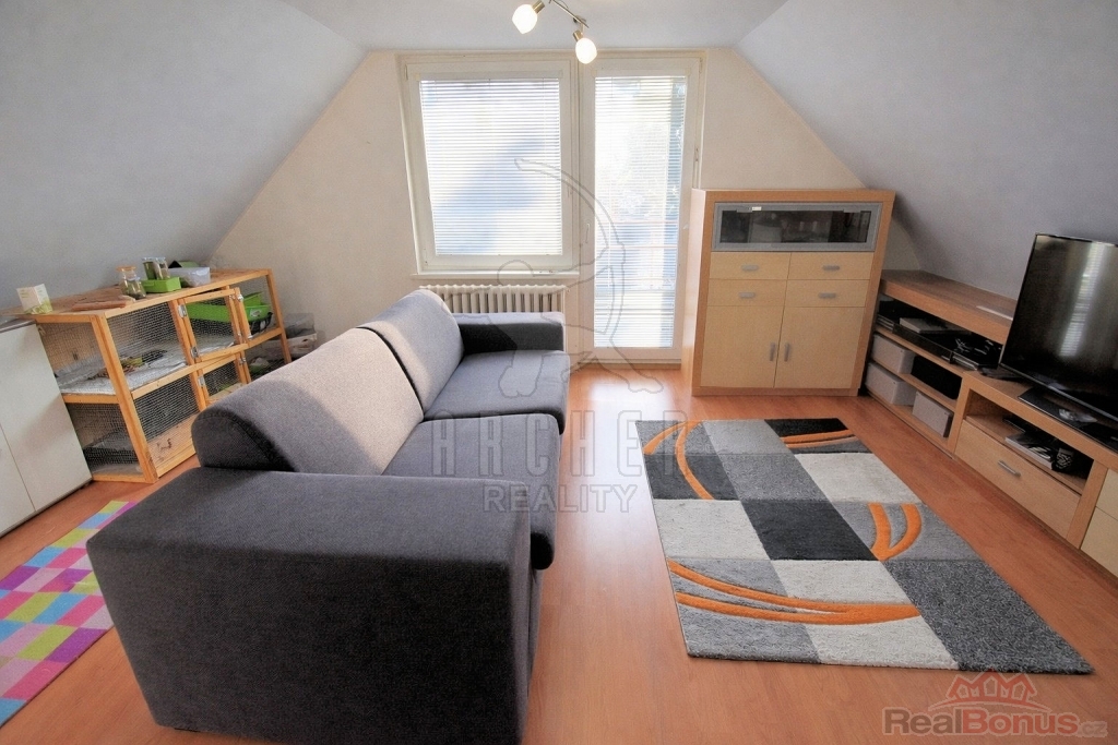 V podkroví slunný obývací pokoj se vstupem na balkon, ložnice a WC s umyvadlem.