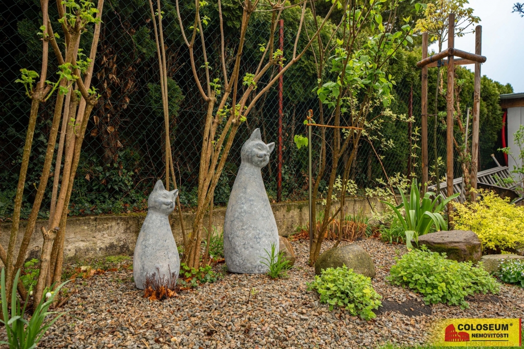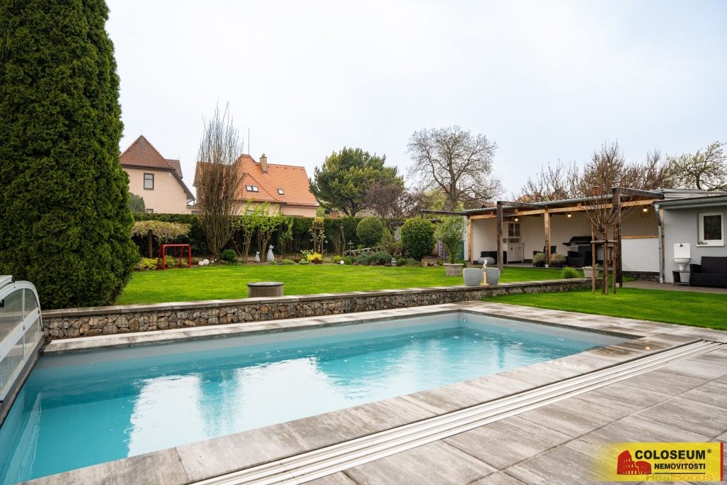 Na pozemku o výměře 760 m2 se nachází krásně udržovaná zahrada s okrasnými záhony. Zahradu a terénní úpravy navrhovala zahradní architektka. Užijete si bazén o rozměrech cca 6 × 3 m se slanou vodou a zastřešením, který jistě potěší během horkých letních dní. Díky tepelnému čerpadlu a vyhřívání si můžete užívat koupání i v chladnějších měsících. Filtraci ovládáte automaticky přes mobilní telefon. Na bazén navazuje terasa, která spojuje bazén s domem. K dispozici je také zahradní domek, letní kuchyň, automatický zavlažovací systém a příprava na instalaci solární sprchy ? to vše pro maximální pohodlí a úsporu energií. Parkování zajištěno v garáži a na vlastním pozemku - na parkovací plochu vedle domu vjedete bránou na elektrický pohon.