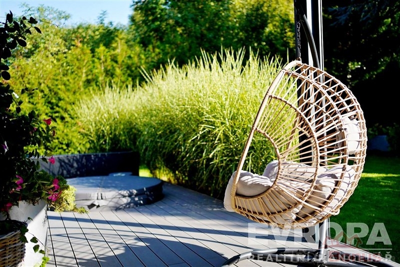 Pozemek se vzrostlými stromy, keři a okrasnou zahradou zaručuje naprosté soukromí a ničím nerušený výhled do údolí. Parkování je zajištěno v garáži a na čtyřech venkovních stáních na vlastním pozemku u domu.