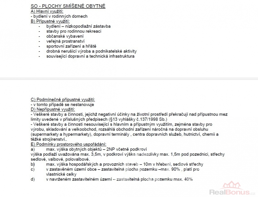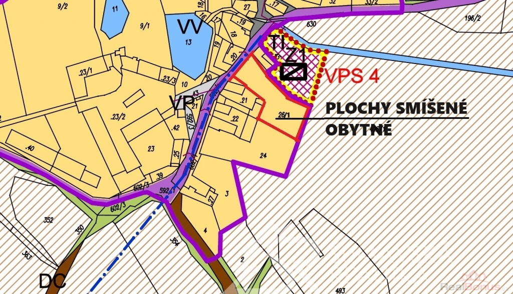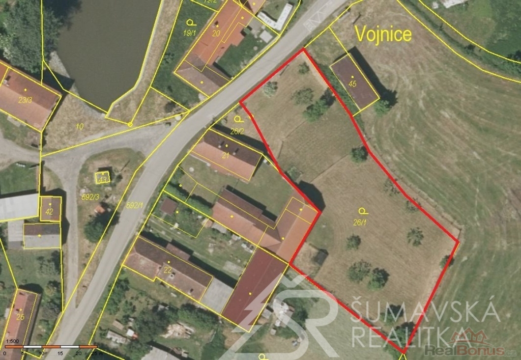 Popis pozemku: v platném územním plánu leží pozemek v plochách smíšených obytných, prvotně určených pro bydlení v rodinných domech. Ty zde mohou být dokonce dva! Pro ty je přivedeno i připojení dvou měření od distributora elektřiny E.ON. Z rovinatého pozemku s jižní orientací se otvírá krásný výhled - územní plán už další výstavbu v okolí nepovoluje, tím je zaručen klid, výhled a soukromí. Komunikační napojení je přímé na místní asfaltovou komunikaci. Pozemek je kompletně oplocený a podél komunikace je i kamenná podezdívka s rámovým pletivem do ocelových sloupků. Vodu je možné napojit z obecního vodovodního řadu vedoucí v přilehlé komunikaci. Obec nemá čistírnu odpadních vod, tak je třeba řešit individuálně vlastní ČOV. Elektřina přivedena na pozemek.