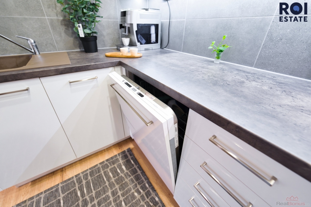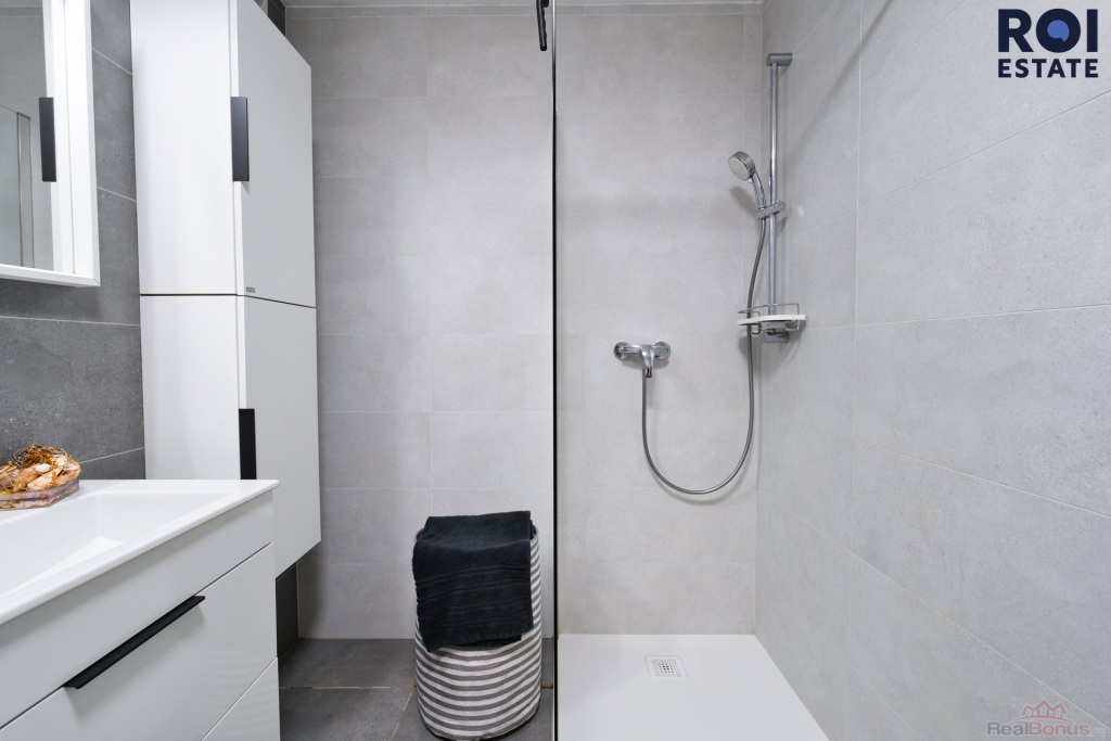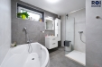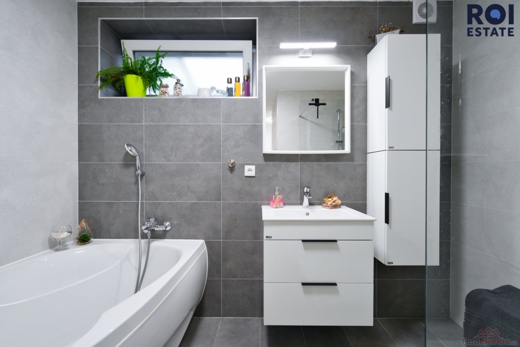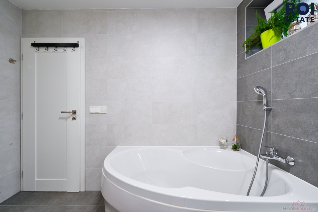 - moderní koupelna s vanou, sprchovým koutem a prostorem pro pračku a sušičku,