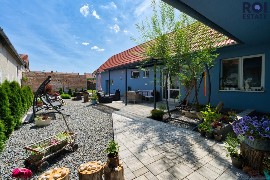 Za vstupními vraty vás uvítá průjezd, odkud se dostanete do útulného dvora s prostornou zastřešenou terasou, ideálním místem pro rodinné oslavy, grilování s přáteli nebo jen odpočinek s knihou.