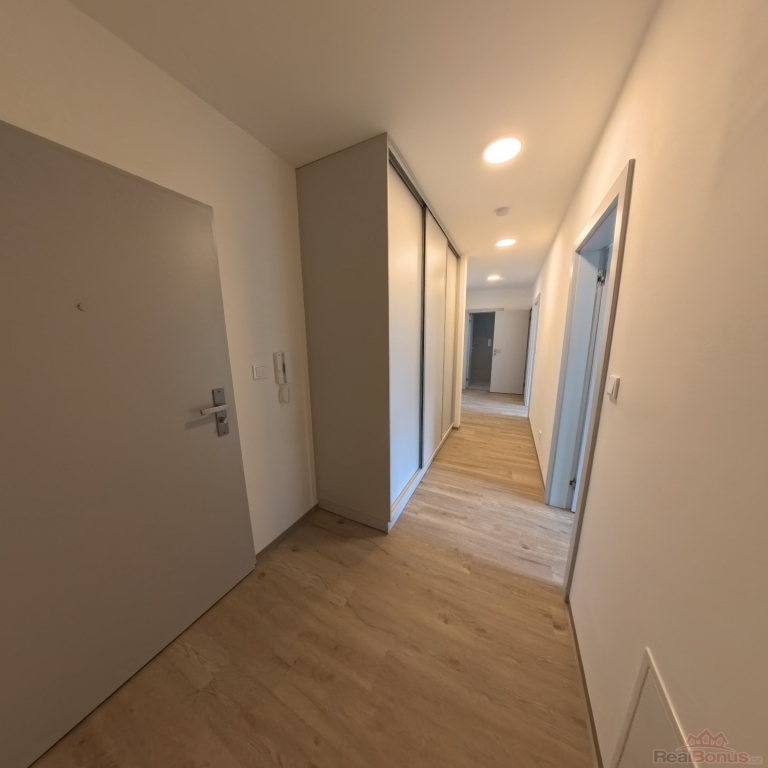 Samotný byt nabízí vstupní chodbu, kde je dále vstup do ložnice, dětského pokoje, kuchyně s obývacím pokojem, koupelny s vanou a oddělené WC. Z obývacího pokoje s kuchyňským koutem je vstup na balkón 5,3 m2. Kuchyňská linka je kompletně vybavena varnou deskou, troubou, digestoří, myčkou a vestavěnou lednicí. V chodbě je pračka a sušička ve vestavěné skříni. Do bytu je zavedena pozemní TV anténa, připraveny jsou rozvody pro internet. Byt je vhodný pro nekuřáky a bez domácích mazlíčků.