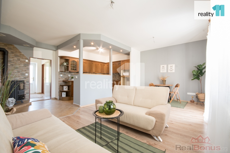 Dispozice domu: 2x vstupní zádveří - chodba, obývací pokoj, který je propojen s kuchyňským koutem, další tři pokoje, koupelna se sprchovým koutem, samostatné WC a prostorná spíž. Z obývacího pokoje je francouzskými dveřmi vstup na zahradu. Na dům navazuje dílna, ze které je rovněž vstup do zahrady a do půdního prostoru.