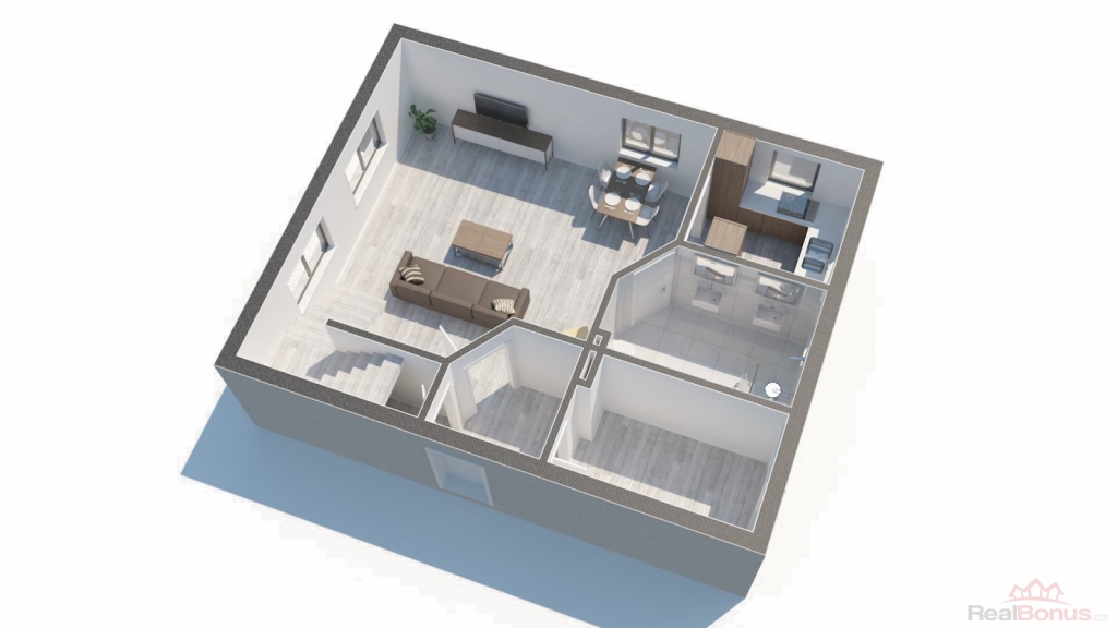 V přízemí vás uvítá prostorná předsíň s vestavěnou šatnou a vstupem do technické místnosti. Odtud pokračujete do samostatné koupelny s toaletou a do hlavního obytného prostoru světlého obývacího pokoje s vestavěným akváriem a krbem s rozvodem teplého vzduchu. Obývák plynule navazuje na částečně oddělený kuchyňský kout a francouzskými dveřmi se otevírá na krytou terasu směřující do zahrady. Do patra vede schodiště z obývací části; zde se nachází centrální hala, tři neprůchozí pokoje, ložnice a druhá koupelna se sprchovým koutem a toaletou.