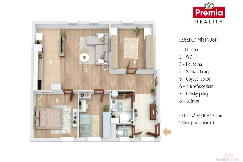 Byt se skládá z prostorného obývacího pokoje propojeného s kuchyňskou částí a jídelnou, dětského pokoje, ložnice a další místnosti, která v současné době slouží jako šatní místnost.