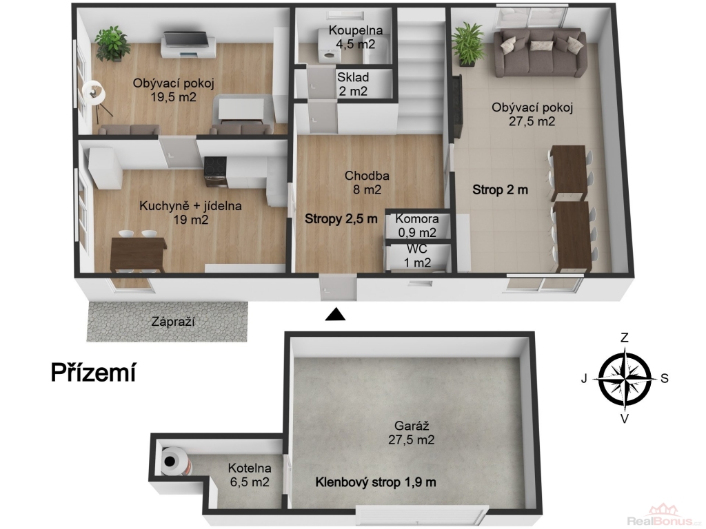 Patrový rodinný dům 4+1 nabízí obytnou plochu 126?m2 a navíc půdní a skladové prostory o výměře 36,5?m2 s možností další obytné vestavby. V 1. PP se nachází garáž a kotelna. V domě je mnoho úložných ploch, což ocení zejména větší rodina nebo aktivní domácnosti. Ve foto galerii najdete půdorysy s rozměry všech částí domu a příslušenství.