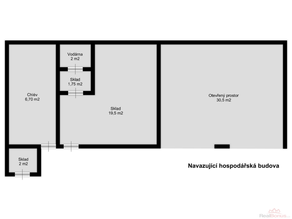 Dům přímo navazuje na samostatnou hospodářskou budovu o ploše 63?m2, která slouží jako sklad. Část budovy je otevřená ? ideální jako přístřešek pro parkování nebo místo pro posezení s grilem a přáteli.
