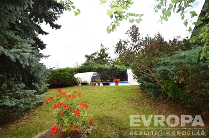 Vzrostlá zeleň v zahradě zajišťuje dostatek soukromí, milou atmosféru dotváří venkovní krb, maximum komfortu potom vyhřívaný bazén se zastřešením.
