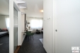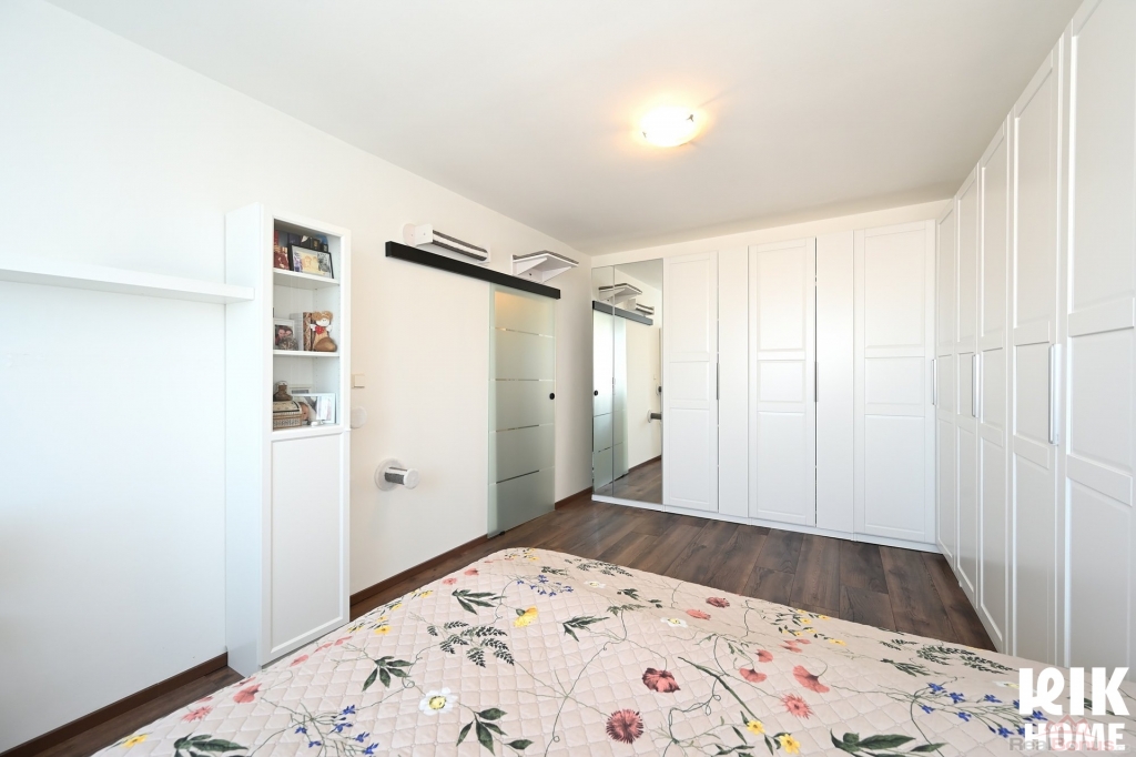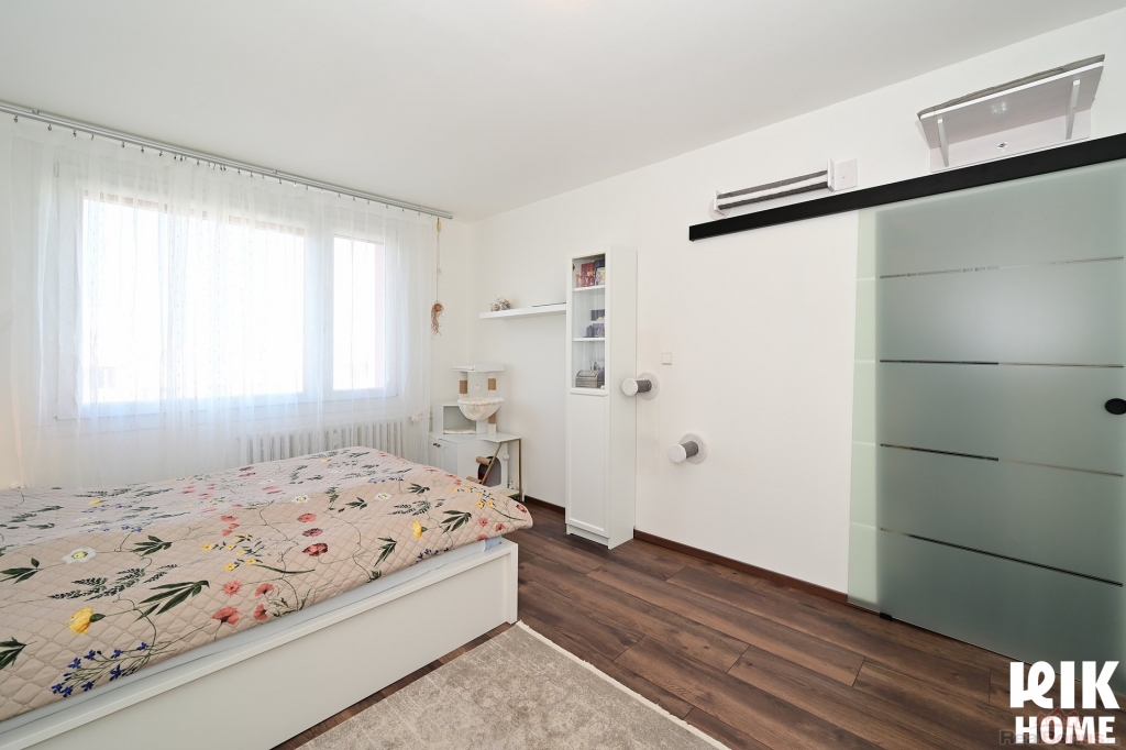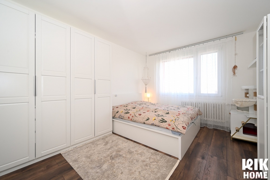 Ložnice je oddělená zdí s výbornými protihlukovými vlastnostmi ? v obývacím pokoji si můžete užívat sledování televize, aniž byste rušili odpočinek v ložnici. Orientace na sever až severovýchod poskytuje krásný výhled na Prahu, včetně ikonické Žižkovské televizní věže. Ložnice je prosvětlena ranním sluncem, zatímco večer zůstává v příjemném chládku, což zajišťuje světlý a vzdušný prostor bez rizika přehřívání v letních měsících.