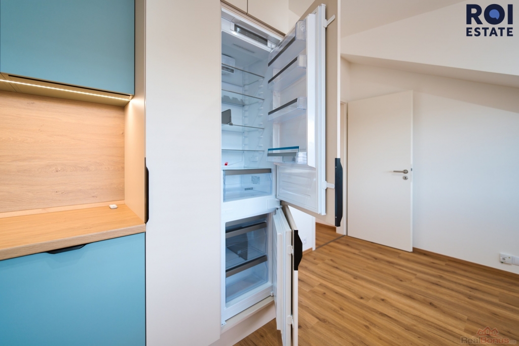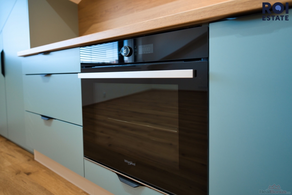 Vybavení bytu: moderní kuchyňská linka s kvalitními spotřebiči, pračka se sušičkou, vestavěné skříně na míru v předsíni a v ložnici.