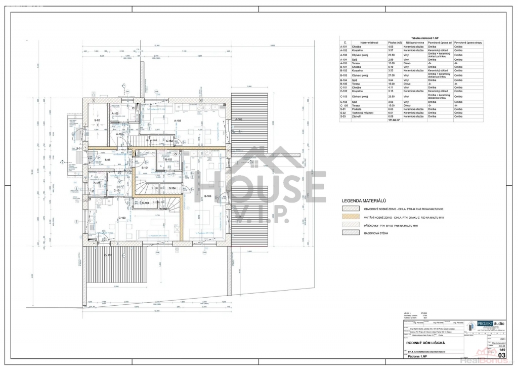 1. NP ? prostorný obývací pokoj s kuchyňským koutem a vstupem na terasu a zahradu (56,33 m2), spíž, předsíň se schodištěm, koupelna se sprchovým koutem a WC.