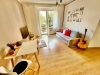 Obývací pokoj má přímý vstup na terasu s posezením. Z terasy vedou schody na dvorek a zahradu domu. Oboje je odděleno od ulice domem. Kuchyňská část obývacího pokoje je vybavena kuchyňskou linkou s vestavěnou horkovzdušnou troubou, plynovou varnou deskou a volně stojící ledničkou s mrazákem. Je zde také jídelní stůl s židlemi. Obývací část je vybavena sedací soupravou a u protější zdi je televize. Ložnice má také výhled do zeleně dvora a vejde se do ní dvojpostel a stůl či šatník.
