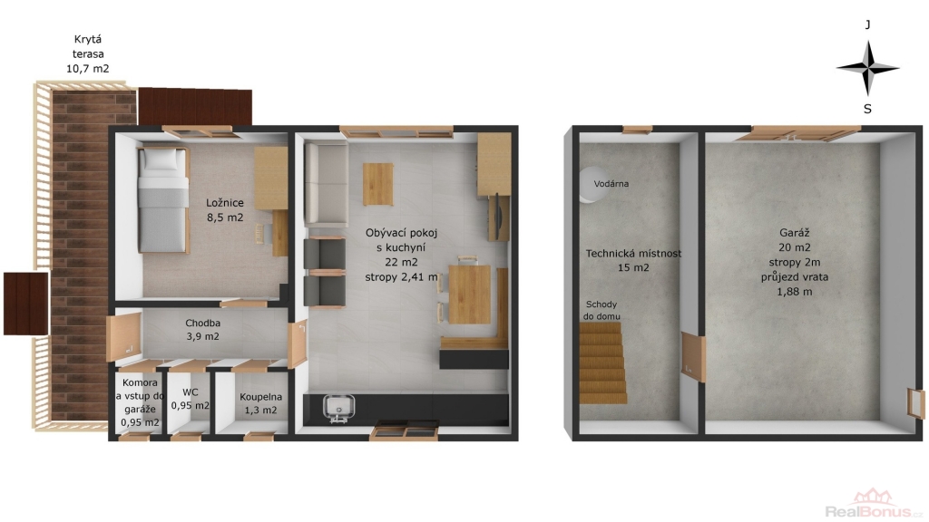 Abych vám ukázal, jak může chata po rekonstrukci vypadat, připravil jsem vizualizaci, která představuje možnost přeměny na moderní a pohodlné bydlení. Díky zděné konstrukci, rozvodům a dispozici je tento objekt skvělým základem pro rekonstrukci a vytvoření domova k trvalému i rekreačnímu užívání, zároveň však může velmi dobře sloužit i v současném stavu.