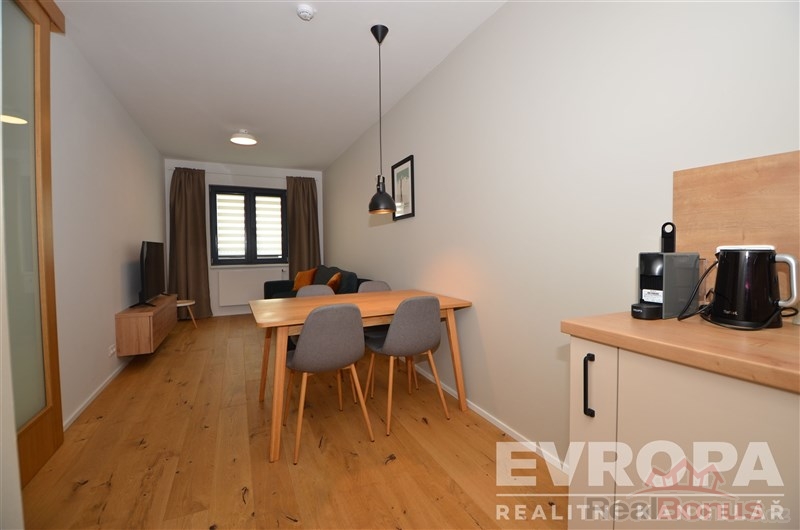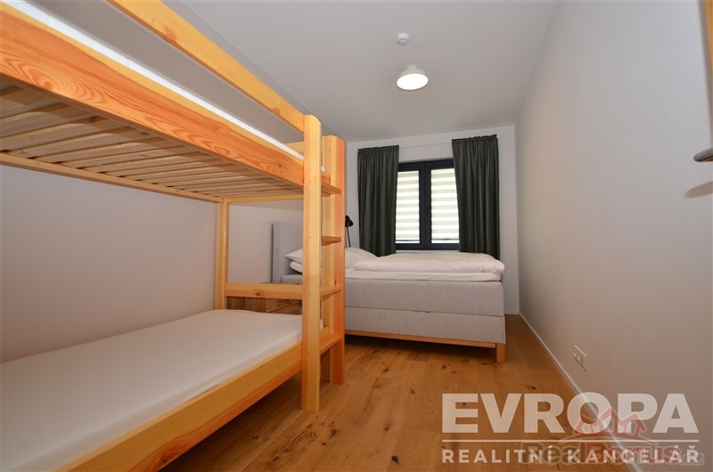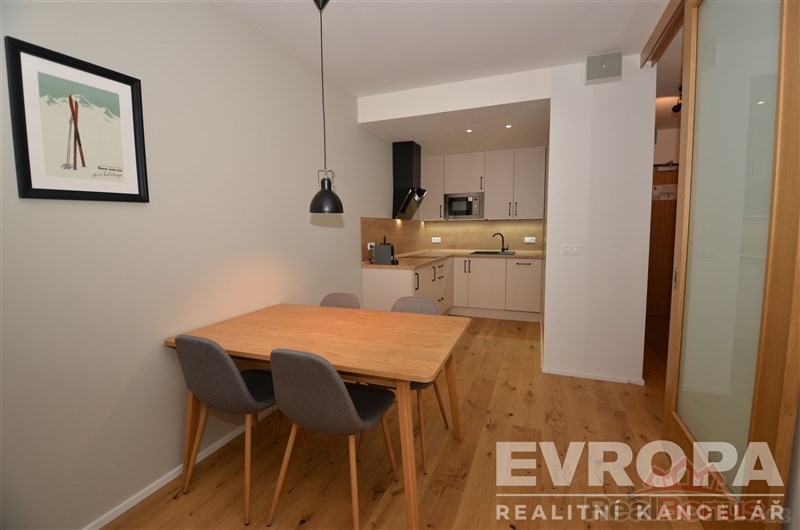 Dispozice apartmánu 2+kk s celkovou výměrou 47,6m2, je umístěn v přízemí 1.NP. Skládá se z předsíně s úložnými vestavěnými skříněmi, obývacího pokoje s jídelním a kuchyňským koutem, kuchyňská linka se spotřebiči. Apartmán se nabízí na prodej včetně kompletního vybavení a zařízení viz. fotografie. Obrovskou výhodou je vlastní venkovní parkovací stání, sklep s přívodem elektřiny pro nabíjení elektrokol a vlastní skibox.