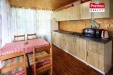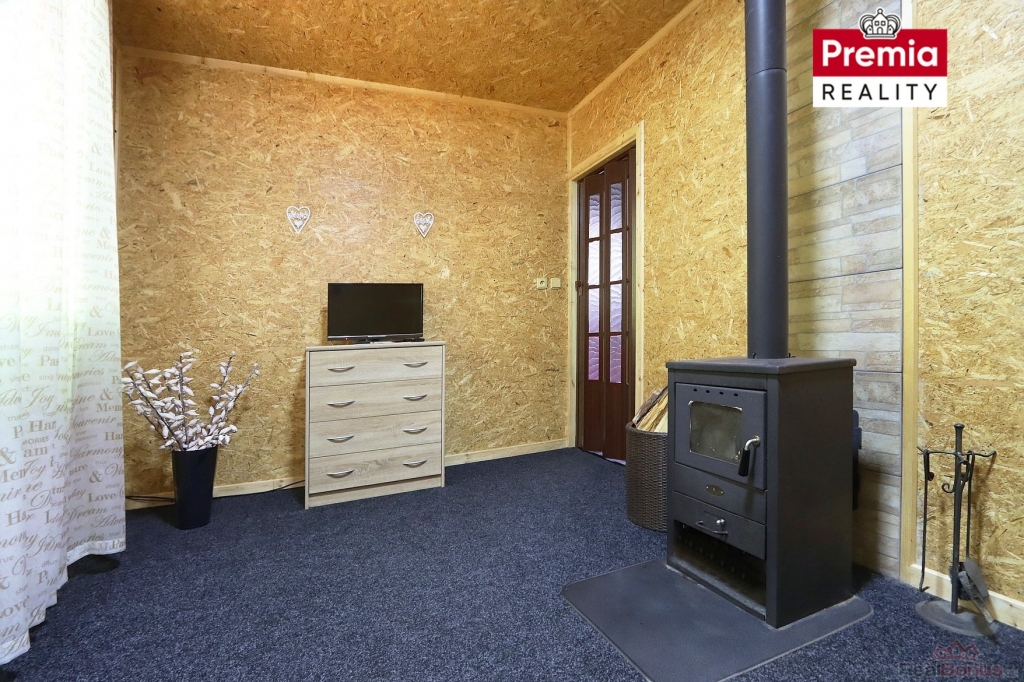Chata (Oáza) má dispozici 3+1 a pohodlně ubytuje až 8 osob. Je plně vybavená ? součástí je kuchyňská linka, sporák, lednice, krbová kamna, zahradní nábytek a další zařízení. Součástí je koupelna, samostatné WC, velká terasa s posezením a úložný prostor pod chatou vhodný na dřevo, kola nebo sportovní vybavení.