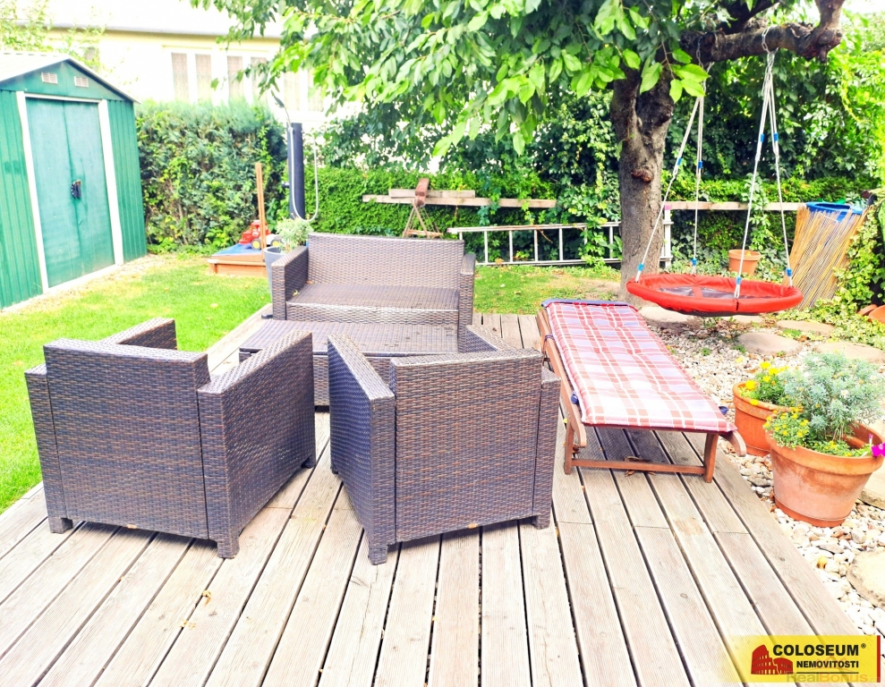 Kolem domu je zahrada, která je tvořena okrasnými stromy a dřevinami, v zadní části nalezneme vybudované vyvýšení záhony k pěstování zeleniny.