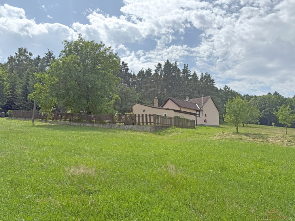 Mezi hlavní budovou a vedlejší stavbou se nachází uzavřený dvorek, který nabízí dostatek soukromí a prostoru k relaxaci. Najdete zde venkovní posezení, krb s udírnou, skleník a prostor pro bazén. Dům stojí na konci obecní cesty, odkud už pokračuje jen les a louky, což zaručuje klidné a nerušené prostředí.