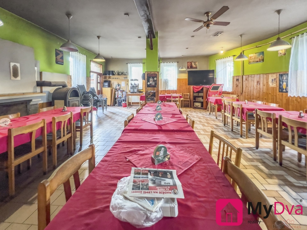 Samotná stavba byla postavena v první polovině 20. století, je cihelno-smíšené konstrukce a v průběhu let prošla průběžnou údržbou a rekonstrukcí. Celková užitná plocha činí téměř 245 m2. Interiér tvoří členité prostory, které zahrnují hlavní sál, menší místnosti, kuchyni, sklady, sociální zázemí a také obytnou část se třemi pokoji. Praktické zázemí doplňuje kotelna, komora, spíž a chodby. V objektu je k dispozici koupelna se sprchovým koutem a několik toalet. Velkým bonusem je také prostorná půda, která nabízí potenciál pro vybudování dalšího bytového prostoru.