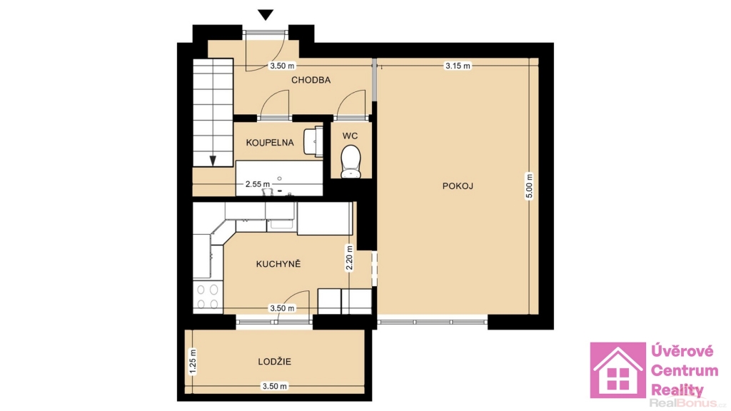 přízemí: předsíň, koupelna s vanou, chodba, toaleta, pokoj, kuchyň a lodžie