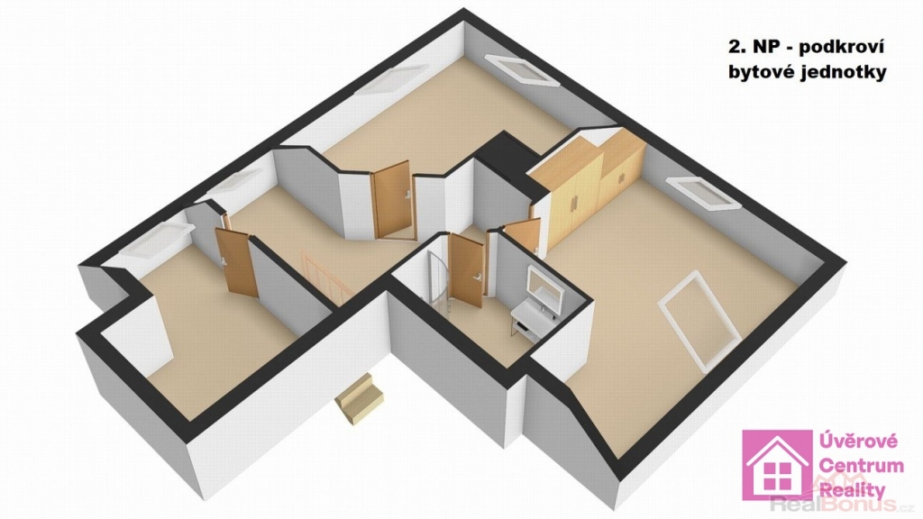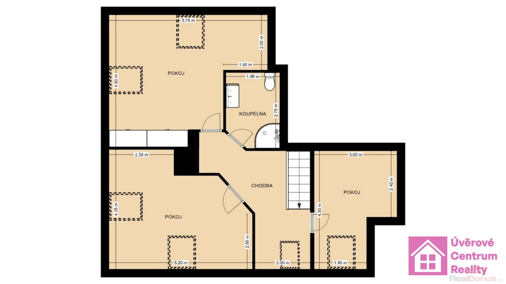 podkroví: schodiště, chodba, tři pokoje a koupelna (sprchový kout) s WC.