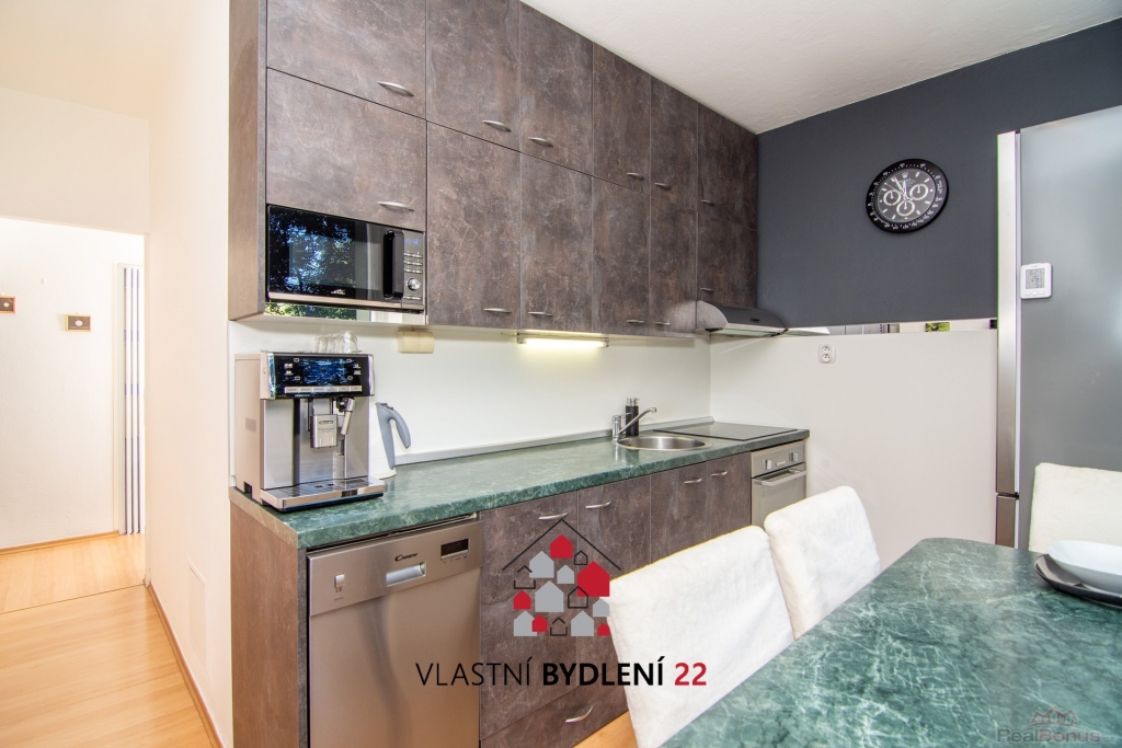 Byt je po rekonstrukci a nabízí se plně vybavený. Součástí je moderní nábytek, veškeré elektrospotřebiče, nádobí, šatna, luxusní značkový kávovar v hodnotě 50.000 Kč a také designový elektrický krb, který vévodí obývacímu pokoji.