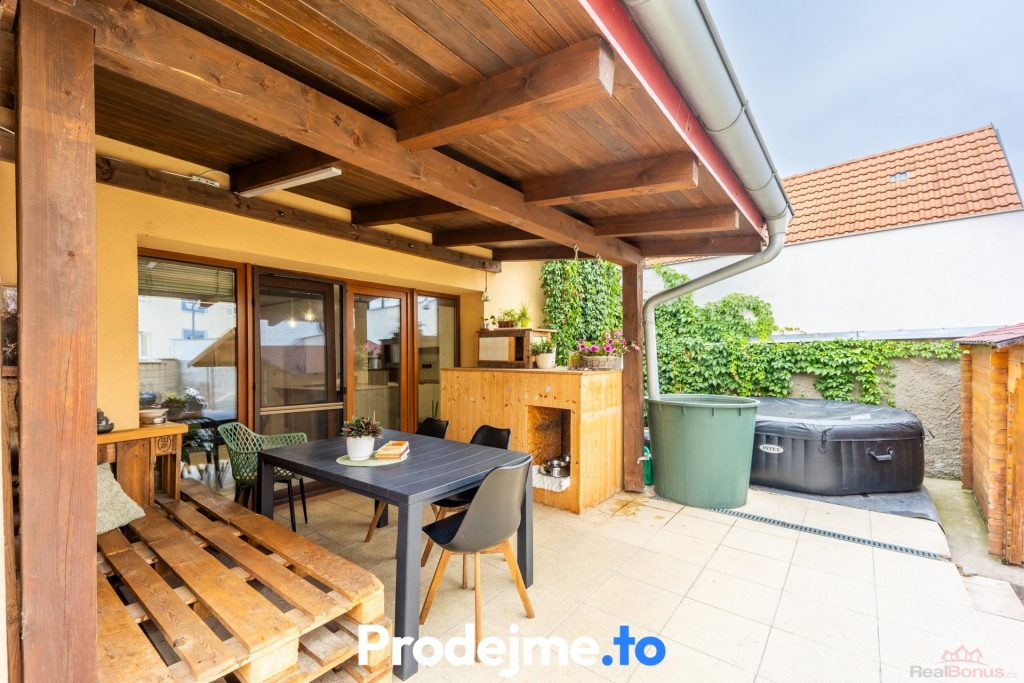 Skvělá lokalita, stylový interiér s praktickými úložnými prostory a příjemný dvorek se zastřešenou terasou a vířivkou! Sem se můžete rovnou nastěhovat, v domě totiž zůstává veškerý nábytek i spotřebiče - kromě pračky a sušičky.