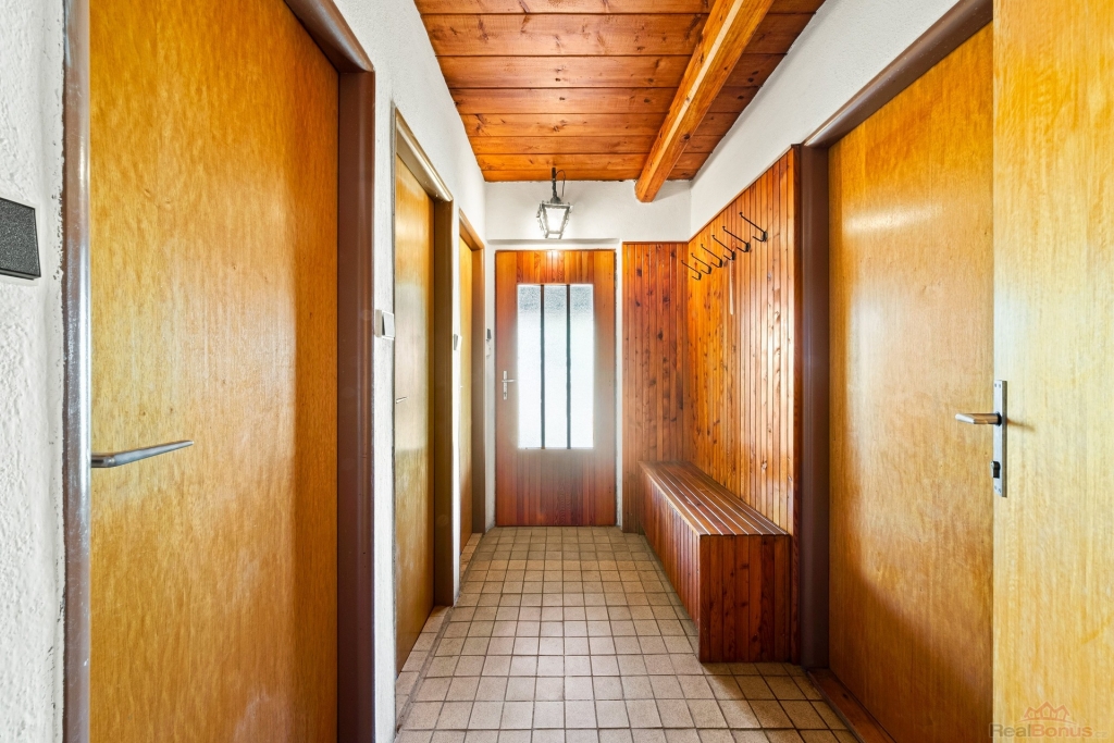 Chata nabízí prostorný obývací pokoj s kuchyňským koutem, který je srdcem společenského života, útulnou ložnici, průchozí skladovou komoru propojenou s garáží, samostatné WC a koupelnu, což zajišťuje pohodlí pro každodenní užívání i víkendovou rekreaci. Dům je kompletně podsklepený a v suterénu se nachází garáž s technickou místností, kde je umístěna vodárna a schodiště propojující s hlavní obytnou částí domu.