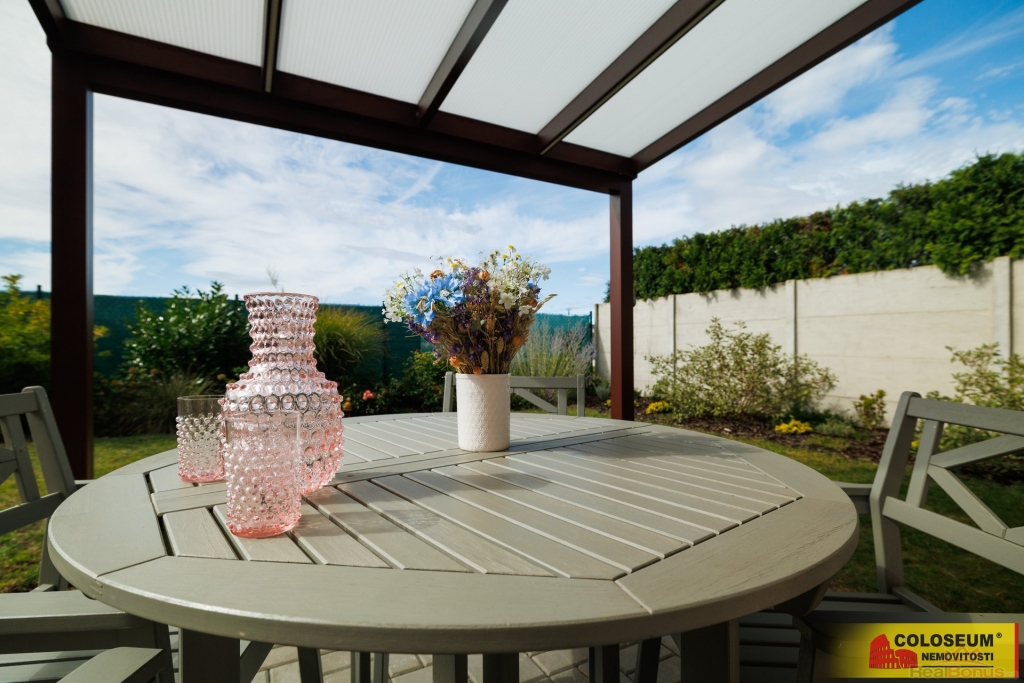 Byt disponuje třemi neprůchozími pokoji, prostornou koupelnou s vanou v teplých přírodních tónech (společnou s toaletou) a velkorysým obývacím pokojem s kuchyní, ze kterého je přímý vstup na terasu krytou pergolou a dále na zatravněnou zahrádku s okrasnou výsadbou. Vlastní pozemek má výměru 257m2.