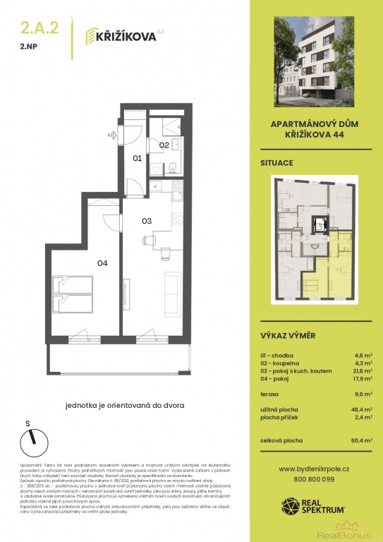 chodba (4,6 m2), obývací pokoj s kuchyňským koutem (21,6 m2), pokoj (17,9 m2), koupelna s WC (4,3 m2), terasa (9,6 m2), sklep