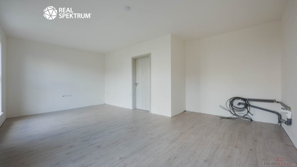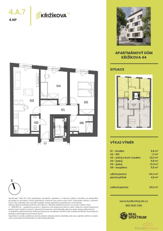 chodba (9,8 m2), obývací pokoj s kuchyňským koutem (22,2 m2), pokoj (13,4 m2), pokoj (11,8 m2), koupelna (5,5 m2), WC (1,7 m2), sklep