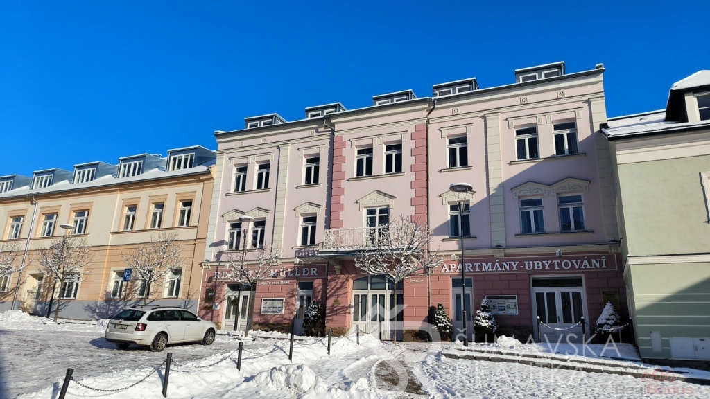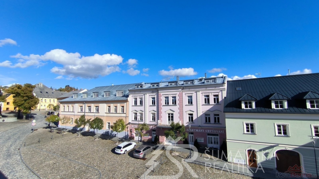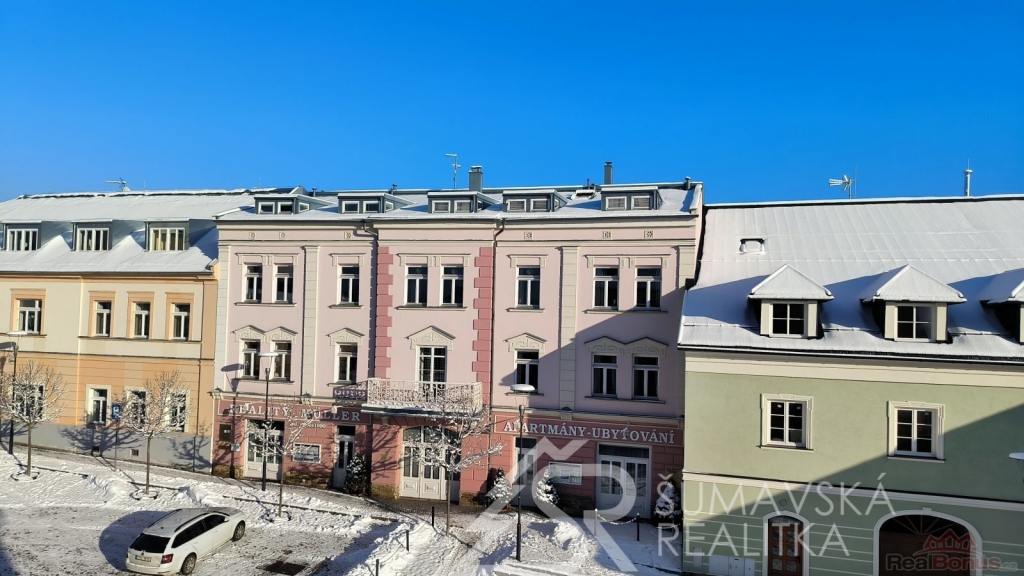 Přímo na gotickém náměstí v Kašperských Horách se nachází zrekonstruovaný dům v jehož 2.NP je nabízený apartmán o podlahové ploše 120 m2, který vznikl spojením dvou sousedních bytů. Nádherný výhled na námětí s kostelem sv.Markéty a radnicí je opravdu nezapomenutelný a neokoukatelný. Byt prošel kompletní modernizací v roce 2020, je nadčasově designově zařízen a v tomto stavu se také prodává. V prostorné předsíni jsou velkorysé vestavěné zrcadlové skříně a vstupy dveřmi z masivu do třech ložnic, obývacího pokoje, kuchyně s jídelnou a dvou koupelen s mramorovým obkladem. Ve větší ložnici je umístěna i infrasauna. Na jedné stěně v kuchyni je zachovalé původní kamenné zdivo, které dodává místnosti punc historie. Vybavení však hovoří o moderní době, kdy zařizovací předměty jsou od firmy Siemens (sklokeramický sporák, vestavěná trouba, digestoř) a myčka Bosch. Krásné jsou i dřevěné kryty radiátorů a velkoformátové dřevěné parkety z teaku v obytných místnostech. Veškerý nábytek byl tvořen na míru. V jedné z koupelen je vířivá vana a bidet. K bytu jsou k dispozici na chodbě dvě samostatné praktické komory a ve vnitřním dvoře parkovací stání.