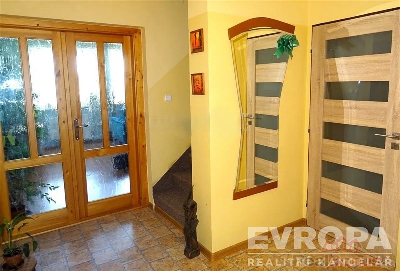 Interiér domu je rozdělen do dvou nadzemních podlaží a jednoho podzemního. V přízemí předsíň, velká koupelna se sprchou a WC, schodiště do patra a hlavní místnostmoderní kuchyň s jídelním koutem a obývací prostor s krbovými kamny. Z obývací části je vstup na zastřešenou velkou terasu s průchodem do zahrady. V patře domu je z chodby vstup do velké koupelny s vanou a WC, dále potom do čtyř samostatných pokojů, z nichž 2 mají vlastní balkony. Celý dům je podsklepený a nachází se zde garáž pro dvě auta, prádelna, technická místnost, spíž, místnost na kola a dílna. Na zahradě najdete nádherný zastřešený vyhřívaný bazén a celoroční vířivku, ohřev zajišťuje tepelné čerpadlo. Zahradu za domem dotváří romantický dřevěný altán.