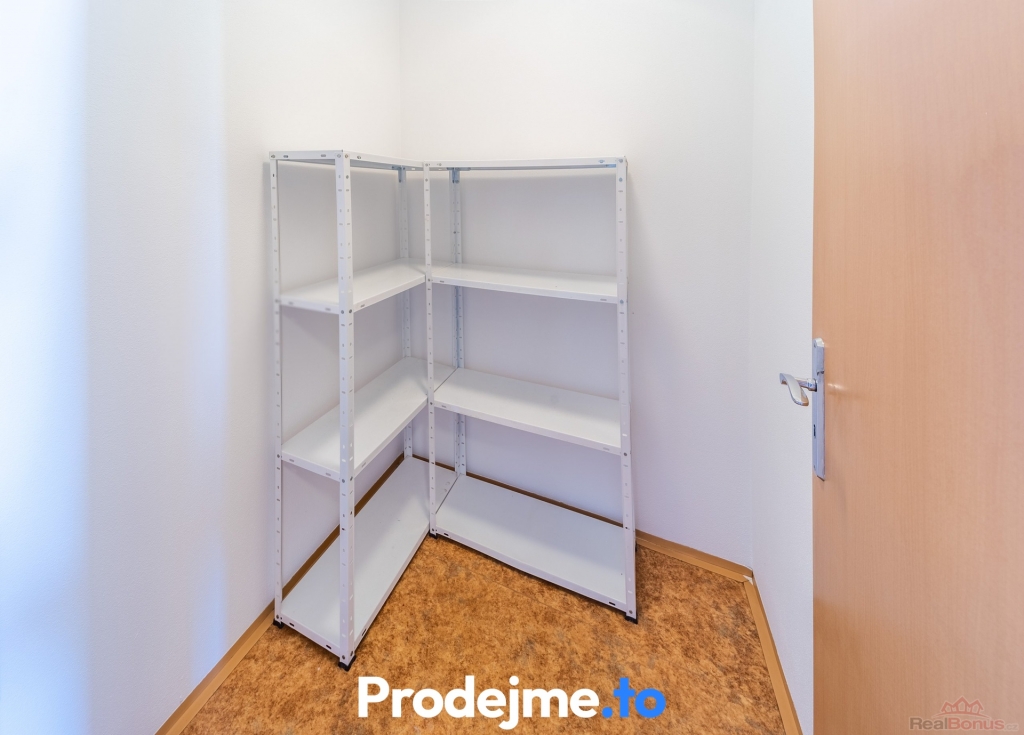 Koupelna disponuje sprchovým koutem, umyvadlem, topným žebříkem a místem na pračku. Toaleta je samostatná. Nezbytnosti uložíte do komory o velikosti 2,33 m2, další skříně se dají umístit na chodbě.