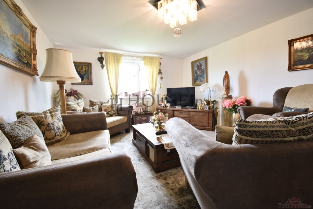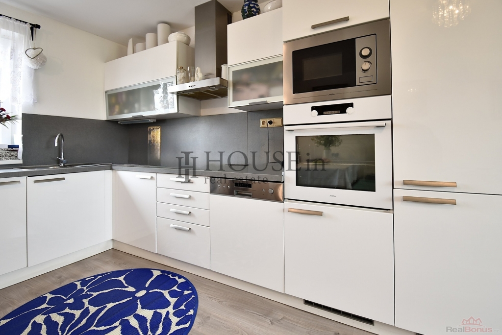 Při vchodu do domu se nachází menší chodbička s botníkem; následně se do bytu dostáváme po schodech. Koupelna disponuje vanou, dvěma umyvadly a ohřívačem na ručníky. Toaleta je zvlášť. Na zemi jsou částečně dlaždice, částečně plovoucí podlaha. Součástí kuchyně je kuchyňská linka, myčka na nádobí, chladnička s mrazákem, indukční deska, trouba a mikrovlnná trouba. Pračka v bytě nebude, třeba míti vlastní. V bytě můžete vidět i komoru/šatnu na uskladnění nejrůznějších věcí. V místnosti, kde je kuchyně se nachází k tomu ještě menší obýváček, hlavní prostorný obývací pokoj je hned vedle, poté vedle sebe následují tři od sebe oddělené pokoje/místnosti, kdy jeden představuje ložnici, druhý dětský pokoj a třetí například pracovnu nebo také další dětský pokoj.