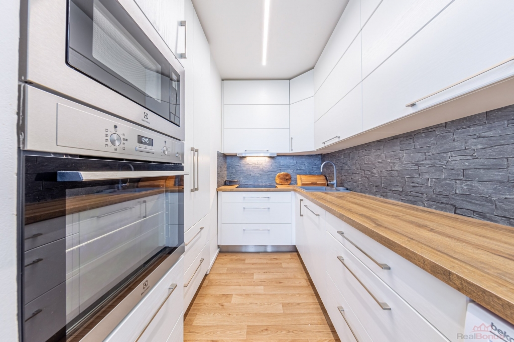 Kuchyňská linka na míru včetně vestavěných spotřebičů (myčka, horkovzdušná trouba včetně indukční desky, mikrovlnná trouba, lednice, digestoř), granitový kuchyňský dřez.