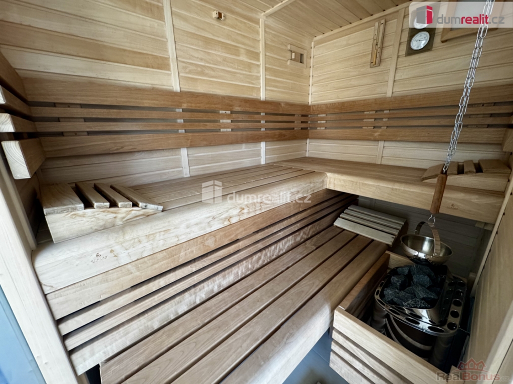 Suterén (45 m): tělocvična, technická místnost, sauna s odpočinkovým prostorem a sprchou