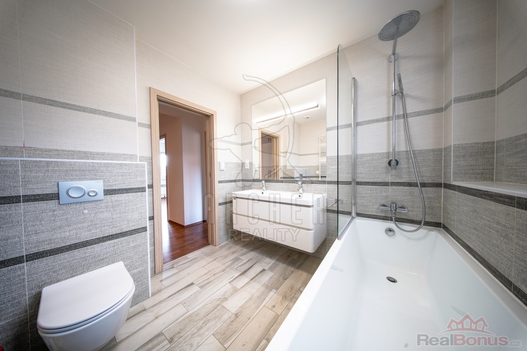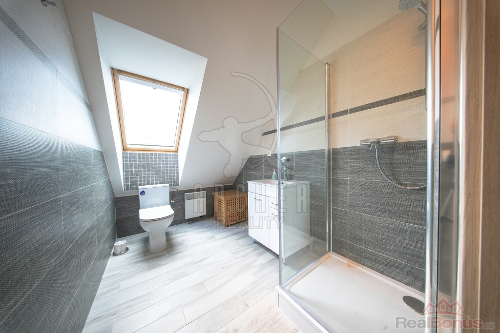 V prvním patře jsou dvě ložnice a velká koupelna s vanou, WC a dvěma umyvadly, aby rána probíhala v pohodě a komfortu. Praktická je vestavěná skříň na chodbě, která využívá volné místo. Ve druhém patře je pak poslední z ložnic, která slouží i jako obývací pokoj. I v tomto patře je koupelna se sprchovým koutem a WC. Vše završuje prostorná půda, která slouží pro odkládání věcí. Dům je tak velmi příjemný k bydlení a vše podtrhuje klimatizace dostupná v prvním a posledním nadzemním podlaží.