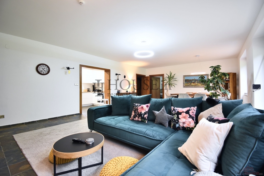 Dům (novostavba 2010, modernizace 2020) nabízí dispozici 3+1 s užitnou plochou 131 m2. Na jednom podlaží najdete předsíň, dílnu/úložný prostor, obývací pokoj s krbovými kamny a vstupem na terasu, kuchyň s jídelním koutem, technickou místnost, koupelnu se sprchou a toaletou, ložnici a dětský pokoj s vlastní koupelnou (vana, sprcha, toaleta). Pronajímá se částečně zařízený ? k dispozici je kuchyňská linka se spotřebiči, jídelní stůl, pohovka a dvoulůžko.
