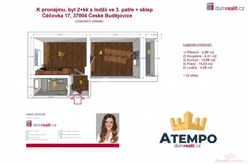 + poplatky za energie ve výši 3.000,-Kč/měsíc. Více informací Vám poskytne makléřka Szepová. , Dumrealit.cz Vám zprostředkuje pronájem světlého, částečně vybaveného bytu 2+kk s lodžií, sklepem a zahradou v klidné části města České Budějovice, ul. Čéčova 17. Byt se pronajímá částečně vybavený (viz. fotografie) a nachází se v zatepleném bytovém domě bez výtahu. K bytu náleží 2 sklepy. Podrobné rozkreslení dispozice naleznete na orientačním plánku mezi fotografiemi. Nájemné činí 14.000,-Kč/ měsíc + zálohové platby za energie ve výši 3.000,-Kč/ měsíc. Parkování je možné před domem v modré zóně za poplatek 500Kč/ rok. Bytová jednotka se nachází v docházkové vzdálenosti do centra České Budějovice. Byt je připraven k okamžitému nastěhování. Hledáme dlouhodobé solidní nájemníky. Více informací Vám poskytne realitní makléřka Ivana Szepová z realitní kanceláře A TEMPO fungující pod ochrannou známkou dumrealit.cz. Ev. číslo: 652697. Energetický štítek: G