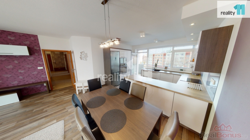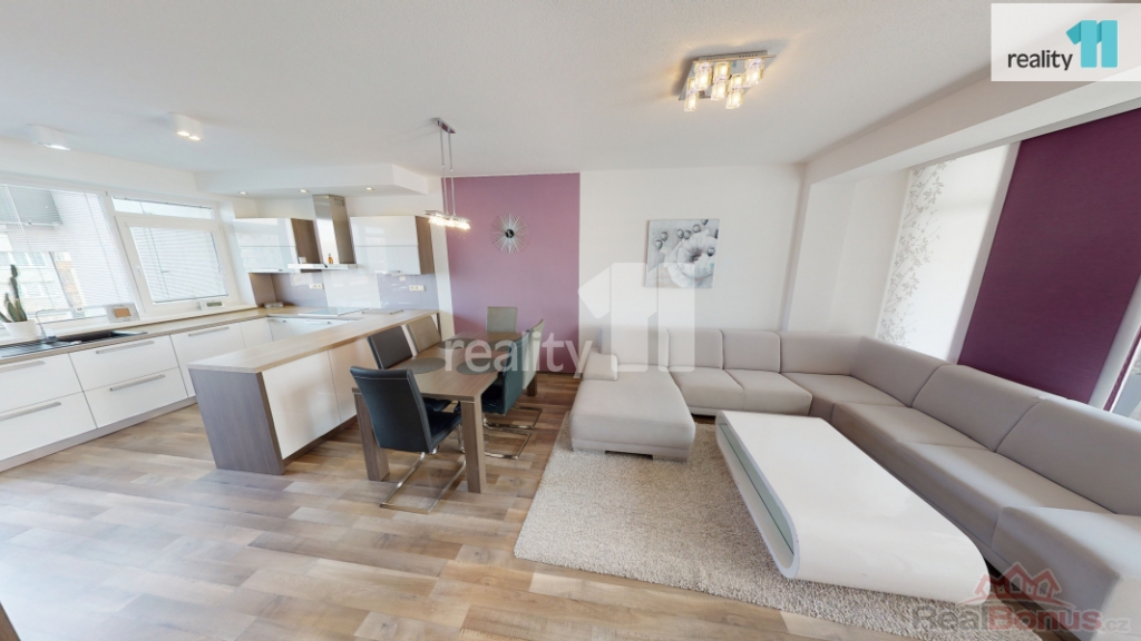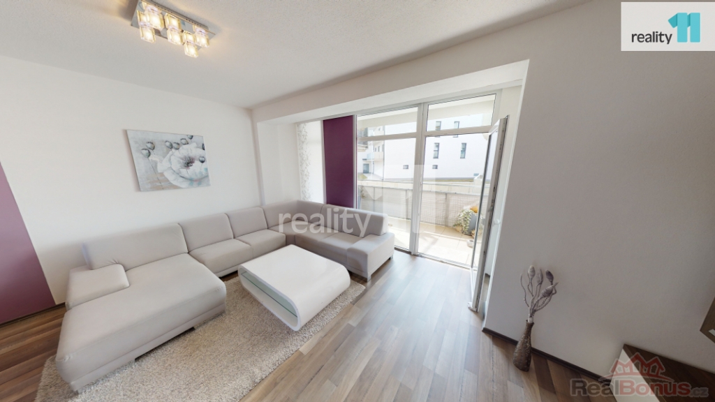 Dispoziční členění: obývací pokoj s kuchyňským koutem 38,23 m, ložnice 13,77 m, dětský pokoj 8,36 m, dětský pokoj II. 8,36 m, chodba 12,98 m, koupelna 6,2 m a samostatné WC 1,8 m. Dále jsou k dispozici dvě prostorné terasy a vlastní sklepní kóje.
