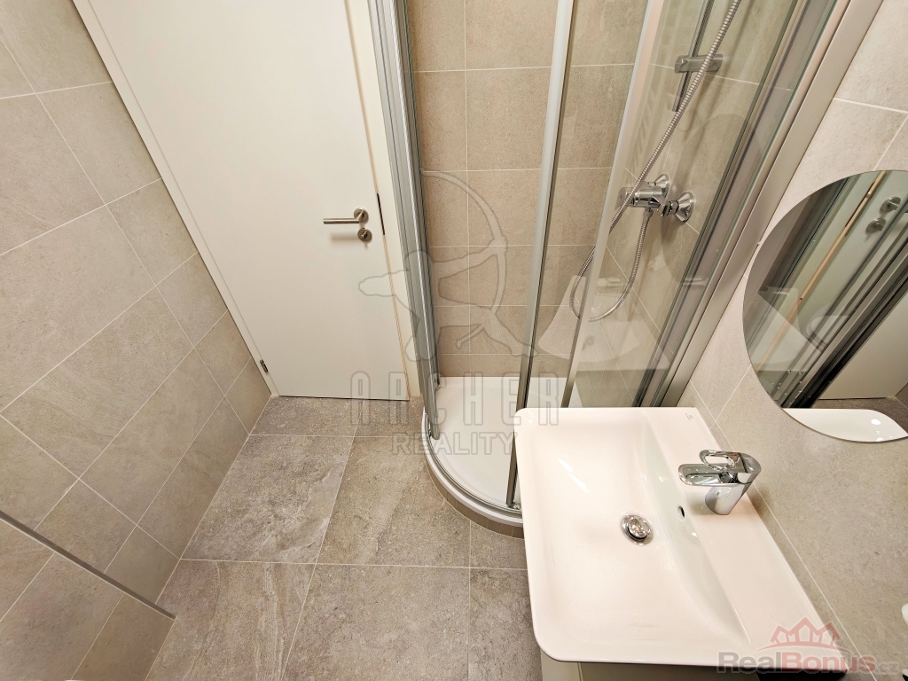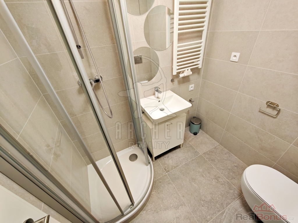 koupelnu se sprchovým koutem, umyvadlem, toaletou, topným žebříkem a přípravou pro pračku.