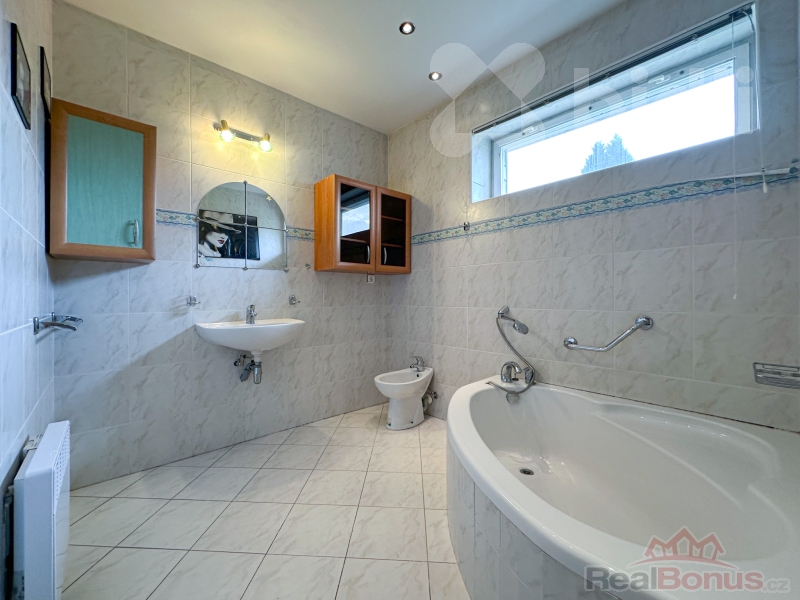 V přízemí vás uvítá prostorný obývací pokoj s krbovými kamny a vstupem do jídelny a kuchyně, která je plně vybavena a má příjemný výhled do zeleně. Nechybí ani koupelna s vanou a samostatné WC. V patře najdete několik ložnic, další koupelnu a dostatek úložného prostoru. Součástí domu je také sauna - ideální pro odpočinek po dlouhém dni - a prostor s přípravou na krytý bazén, který lze dokončit podle vlastních představ. V přízemí je technická místnost, a prostory pro další využití jako například wellness, fitness, kancelář atd. Vytápění je řešeno tepelným čerpadlem (země - voda), elektrokotlem vč. přímotopů jako záložními zdroji. Podlahové topení v každé místnosti nabízí optimální tepelný komfort. Ohřev vody zajišťují solární panely vč. spolupráce s tepleným čerpadlem. Dům je zateplený s odvětrávanou fasádou.