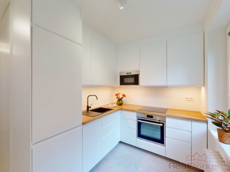 Byt byl navržen ve spolupráci s architekty, kteří vytvořili moderní a funkční dispozici odpovídající požadavkům současného bydlení. Interiér je laděn do útulných odstínů bílé a béžové, s důrazem na kvalitní materiály a precizní zpracování - ať už v nové koupelně, kuchyni, nebo u interiérových dveří.